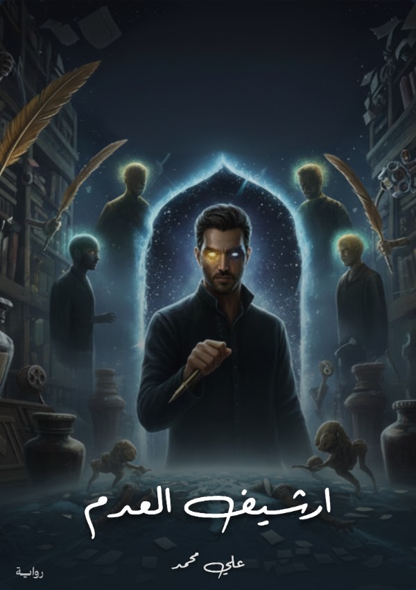 بطل الرواية إياد يقف في قلب مكتبة كونية مظلمة، تطفو من حوله صفحات ممزقة وريش كتابة ذهبية. عينه اليمنى تشع بنور ذهبي (قوة الخلق) واليسرى يسكنها سواد الحبر (قوة المحو). خلفه تظهر أطياف رفاقه الثمانية كأشباح نورانية تحميه، بينما تمتد ظلال "أمين المكتبة" من الزوايا، والأرض تحت قدميه تتحول إلى بحر من الكلمات السائلة والورق العتيق.