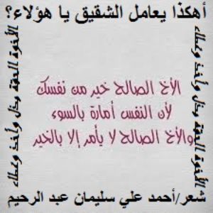كتاب أهكذا يعامل الشقيق يا هؤلاء؟ تأليف أحمد علي سليمان عبد الرحيم .. (بعد أن سعى عامداً في خراب بيت شقيقه ، وصاحبَ الأعداء ، وقام بصياغة الحبكة القصصية والتمثيلية الهزلية ، زاعماً أن الحقيقة يمكن أن تموت بمرور الأيام ، ولم يكن فيه مَعلمٌ من معالم الأخوة التي كان عليها عتبة وشيبة ولدا ربيعة ، فضلاً عن معالم الأخوة في التصور العقدي ، حيث يزعم هذا الجاني أنه من أهله. وقد أرسل شفعاءه ليحقق مبدأ يتوافق عليه كثير من المغالطين هو: من اليوم تعارفنا وننسى ما جرى منا ولا كان ، ولا صار ولا قلتم ، ولا قلنا وإذا به يبتسم لشقيقه ابتسامة البُله والسذج والمنافقين ، واهماً أن الابتسامة يمكن أن تعيد الأخوة المزعومة المفتراة المدعاة ، ونسي أو تناسى بيتاً من الشعر يصف تنافر القلوب فيقول: إن القلوب إذا تنافر ودّها مثل الزجاجة كسْرُها لا يُشعَبَ ومن هنا كانت القصيدة ترجمة لهذا الموقف الأليم المزري من الشقيق الزائف الذي لا يُشرّف. يقول الأستاذ عبد الرحمن الكيلاني عن الأخوة الحقيقية ما نصه: (لا شك أن مفهوم الأخوة في الإسلام يتعلق بالإيمان نفسه وهو قائم على العلاقة في الله ، والرسول - صلى الله عليه وسلم - يقول في الحديث الصحيح: "أوثقُ عُرى الإيمانِ الحُبُّ في اللهِ والبغضُ في اللهِ". وفي الحديث الآخر: "من أحبَّ في الله وأبغضَ في الله فقدِ استكملَ الإيمانَ" لأن الحب من عمل القلب متعلق به. وكذلك البغض ، وهما - أي الحب والبغض - يجب أن يكونا عند المؤمن في الله ولله. فالمؤمن يحب ما أحب الله ورسوله - صلى الله عليه وسلم - وهو يبغض ما أبغض الله ورسوله - عليه الصلاة والسلام -. لذلك ، فإن عمل قلب المؤمن - من حب أو بغض - إنما متعلق بأمر الله تعالى وأمر دينه! لا بهوى النفس وحظوظها ، لأن النفس في ذاتها قد تحب ما يبغض الله - والعياذ بالله – وبالعكس ، فإنها قد تبغض ما يحب الله تعالى. وهذا - بلا شك - نقص وشرخ في إيمان المرء. لذلك ، فإن مفهوم الحب في الله والبغض فيه - سبحانه - له موازين تحكمه. يقول المولى عز وجل: (والعَصْرِ. إنَّ الإنْسانَ لفي خُسْرٍ. إلاّ الذينَ آمنوا وعَمِلوا الصّالحاتِ وتَواصَوْا بِالحَقِّ وتواصَوْا بالصَّبْرِ). روى الطبري في تفسيره جامع البيان بسنده عن مجاهد: "(إن الإنسان لفي خسر) إلا من آمن (إلا الذين آمنوا وعملوا الصالحات) يقول: إلاّ الذين صدقوا الله ووحدوه ، وأمروا له بالوحدانية والطاعة ، وعملوا الصالحات ، وأدوا ما لزمهم من فرائضه ، واجتنبوا ما نهاهم عنه من معاصيه ، واستثنى الذين آمنوا من الإنسان ، لأن الإنسان بمعنى الجمع ، لا بمعنى واحد".