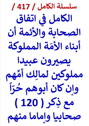 سلسلة الكامل / كتاب رقم ( 417 ) / ( الكامل في اتفاق الصحابة والأئمة أن أبناء الأمَة المملوكة يصيرون عبيدا مملوكين لمالِك أمِّهم وإن كان أبوهم حرا مع ذِكر ( 120 ) صحابيا وإماما منهم ) ، لمؤلفه د/ عامر الحسيني