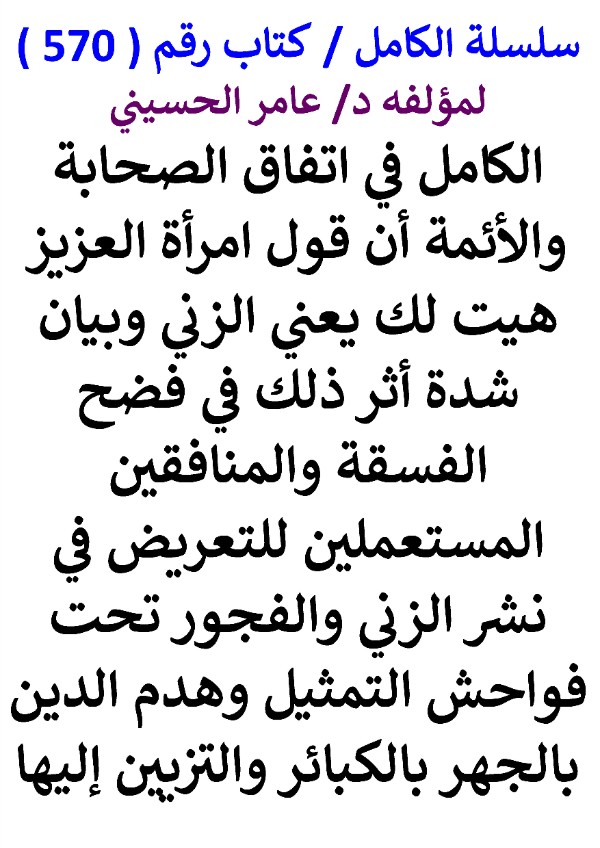 سلسلة الكامل / كتاب رقم ( 570 ) / ( الكامل في اتفاق الصحابة والأئمة أن قول امرأة العزيز هيت لك يعني الزني وبيان شدة أثر ذلك في فضح الفسقة والمنافقين المستعملين للتعريض في نشر الزني والفجور تحت فواحش التمثيل وهدم الدين بالجهر بالكبائر والتزيين إليها ) ، لمؤلفه د/ عامر الحسيني