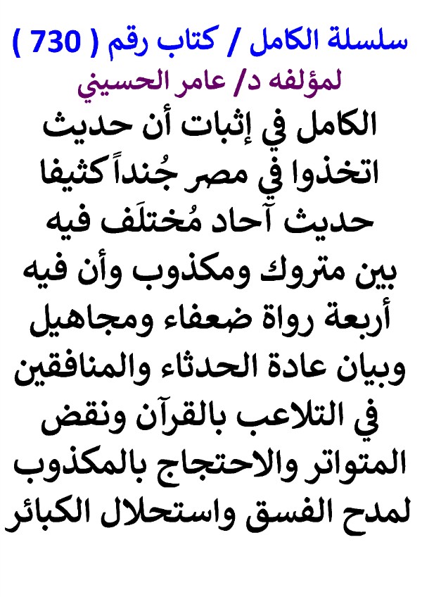 سلسلة الكامل / كتاب رقم ( 730 ) / ( الكامل في إثبات أن حديث اتخذوا في مصر جندا كثيفا حديث آحاد مختلف فيه بين متروك ومكذوب وأن فيه أربعة رواة ضعفاء ومجاهيل وبيان عادة الحدثاء والمنافقين في التلاعب بالقرآن ونقض المتواتر والاحتجاج بالمكذوب لمدح الفسق واستحلال الكبائر ) ، لمؤلفه د/ عامر الحسيني