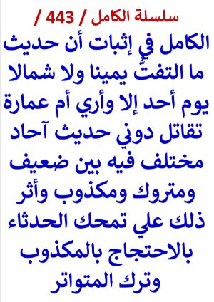 كتاب الكامل في اثبات ان حديث ما التفت يمينا ولا شمالا احاد مختلف فيه بين ضعيف ومتروك ومكذوب بقلم عامر الحسيني .. سلسلة الكامل / كتاب رقم ( 443 ) / ( الكامل في إثبات أن حديث ما التفت يمينا ولا شمالا يوم أحد إلا وأري أم عمارة تقاتل دوني حديث آحاد مختلف فيه بين ضعيف ومتروك ومكذوب وأثر ذلك علي تمحك الحدثاء بالاحتجاج بالمكذوب وترك المتواتر ) ، لمؤلفه د/ عامر الحسيني .