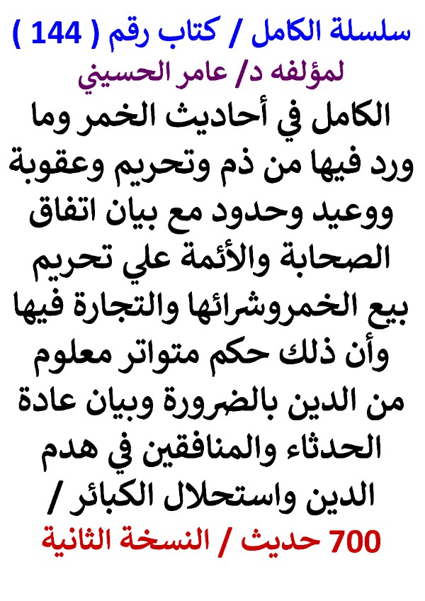 سلسلة الكامل / كتاب رقم ( 144 ) / ( الكامل في أحاديث الخمر وما ورد فيها من ذم وتحريم وعقوبة ووعيد وحدود مع بيان اتفاق الصحابة والأئمة علي تحريم بيع الخمر وشرائها والتجارة فيها وأن ذلك حكم متواتر معلوم من الدين بالضرورة وبيان عادة الحدثاء والمنافقين في هدم الدين واستحلال الكبائر / 700 حديث / النسخة الثانية ) ، لمؤلفه د/ عامر الحسيني