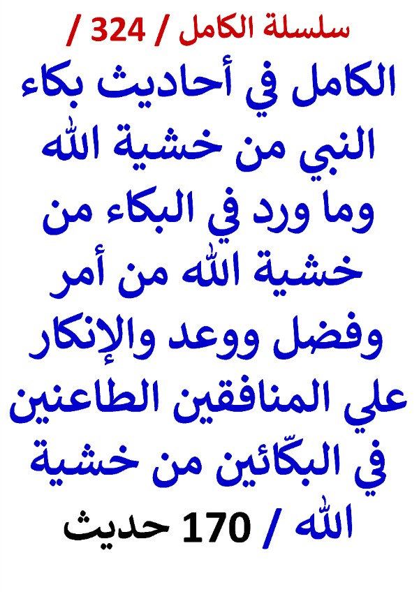 سلسلة الكامل / كتاب رقم ( 324 ) / ( الكامل في أحاديث بكاء النبي من خشية الله وما ورد في البكاء من خشية الله من أمر وفضل ووعد والإنكار علي المنافقين الطاعنين في البكائين من خشية الله / 170 حديث ) ، لمؤلفه د/ عامر الحسيني