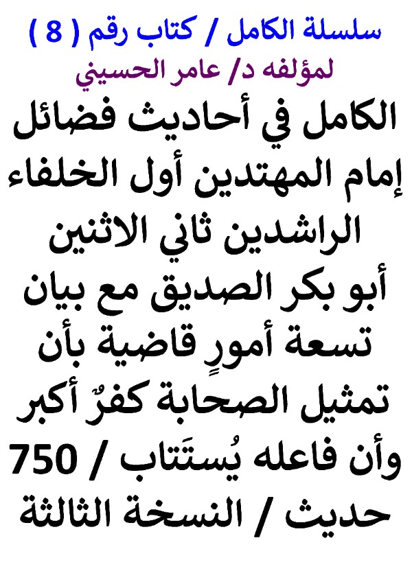 سلسلة الكامل / كتاب رقم ( 8 ) / ( الكامل في أحاديث فضائل إمام المهتدين أول الخلفاء الراشدين ثاني الاثنين أبو بكر الصديق مع بيان تسعة أمورٍ قاضية بأن تمثيل الصحابة كفرٌ أكبر وأن فاعله يُستَتاب / 750 حديث / النسخة الثالثة ) ، لمؤلفه د/ عامر الحسيني