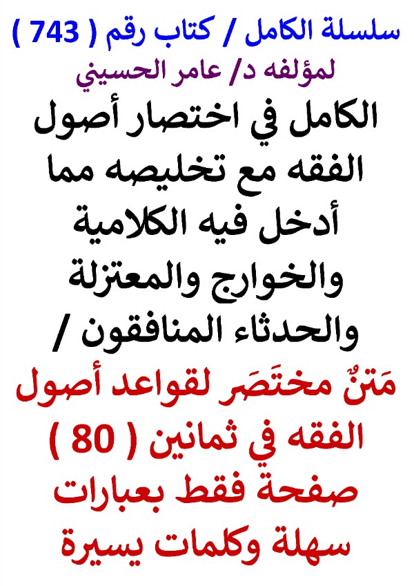 سلسلة الكامل / كتاب رقم ( 743 ) / ( الكامل في اختصار أصول الفقه مع تخليصه مما أدخل فيه الكلامية والخوارج والمعتزلة والحدثاء المنافقون / مَتنٌ مختَصَر لقواعد أصول الفقه في ثمانين ( 80 ) صفحة فقط بعبارات سهلة وكلمات يسيرة ) ، لمؤلفه د/ عامر الحسيني