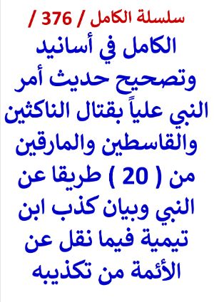 كتاب الكامل في اسانيد وتصحيح حديث امر النبي عليا بقتال الناكثين والقاسطين والمارقين بقلم عامر الحسيني ... سلسلة الكامل / كتاب رقم ( 376 ) / ( الكامل في أسانيد وتصحيح حديث أمر النبي علياً بقتال الناكثين والقاسطين والمارقين من عشرين ( 20 ) طريقا عن النبي وبيان كذب ابن تيمية فيما نقل عن الأئمة من تكذيبه ) لمؤلفه د/ عامر الحسيني