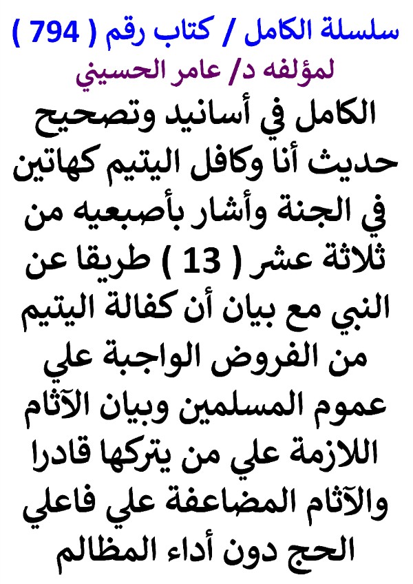 سلسلة الكامل / كتاب رقم ( 794 ) / ( الكامل في أسانيد وتصحيح حديث أنا وكافل اليتيم كهاتين في الجنة وأشار بأصبعيه من ثلاثة عشر ( 13 ) طريقا عن النبي مع بيان أن كفالة اليتيم من الفروض الواجبة علي عموم المسلمين وبيان الآثام اللازمة علي من يتركها قادرا والآثام المضاعفة علي فاعلي الحج دون أداء المظالم ) ، لمؤلفه د/ عامر الحسيني