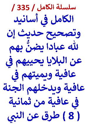 كتاب الكامل في اسانيد وتصحيح حديث ان لله عبادا يضن بهم عن البلايا من 8 طرق عن النبي  بقلم عامر الحسيني......سلسلة الكامل / كتاب رقم ( 335 ) / ( الكامل في أسانيد وتصحيح حديث إن لله عبادا يضن بهم عن البلايا يحييهم في عافية ويميتهم في عافية ويدخلهم الجنة في عافية من ثمانية ( 8 ) طرق عن النبي ) ، لمؤلفه د/ عامر الحسيني