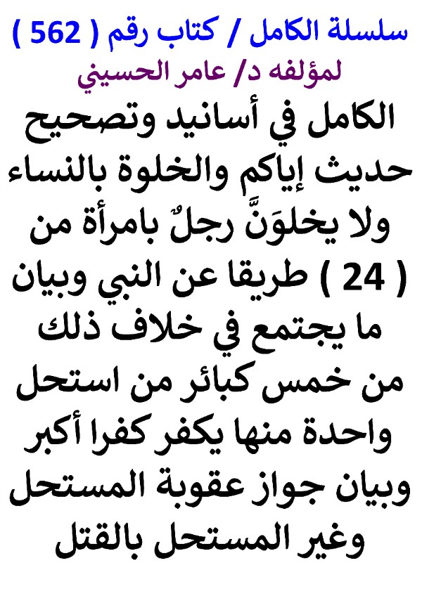 سلسلة الكامل / كتاب رقم ( 562 ) / ( الكامل في أسانيد وتصحيح حديث إياكم والخلوة بالنساء ولا يخلوَنَّ رجلٌ بامرأة من ( 24 ) طريقا عن النبي وبيان ما يجتمع في خلاف ذلك من خمس كبائر من استحل واحدة منها يكفر كفرا أكبر وبيان جواز عقوبة المستحل وغير المستحل بالقتل ) ، لمؤلفه د/ عامر الحسيني