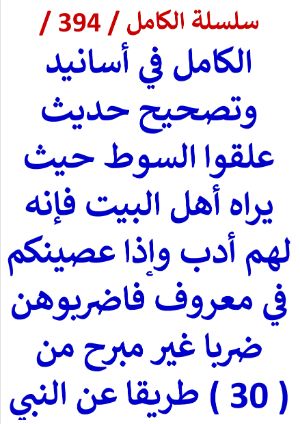 كتاب الكامل في اسانيد وتصحيح حديث علقوا السوط حيث يراه اهل البيت فانه لهم ادب  بقلم عامر الحسيني ... سلسلة الكامل / كتاب رقم ( 394 ) / ( الكامل في أسانيد وتصحيح حديث علقوا السوط حيث يراه أهل البيت فإنه لهم أدب وإذا عصينكم في معروف فاضربوهن ضربا غير مبرح من ثلاثين ( 30 ) طريقا عن النبي ) ، لمؤلفه د/ عامر الحسيني