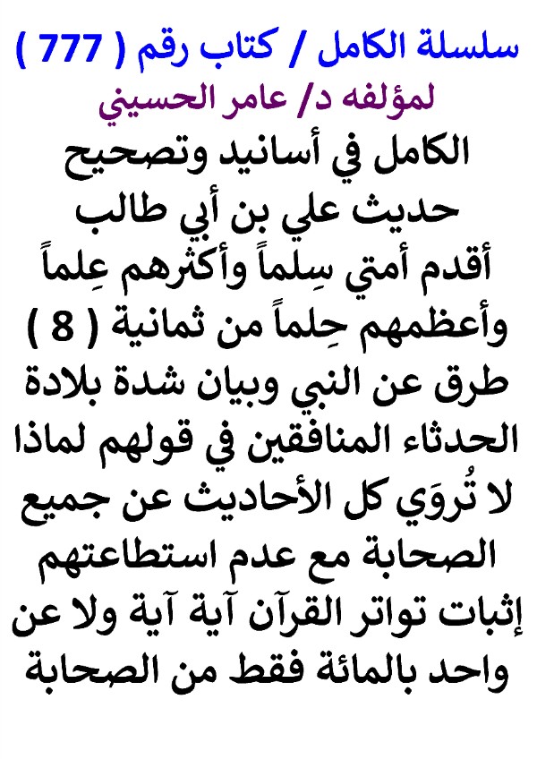 سلسلة الكامل / كتاب رقم ( 777 ) / ( الكامل في أسانيد وتصحيح حديث علي بن أبي طالب أقدم أمتي سلما وأكثرهم علما وأعظمهم حلما من ثمانية ( 8 ) طرق عن النبي وبيان شدة بلادة الحدثاء المنافقين في قولهم لماذا لا تروي كل الأحاديث عن جميع الصحابة مع عدم استطاعتهم إثبات تواتر القرآن آية آية ولا عن واحد بالمائة فقط من الصحابة ) ، لمؤلفه د/ عامر الحسيني