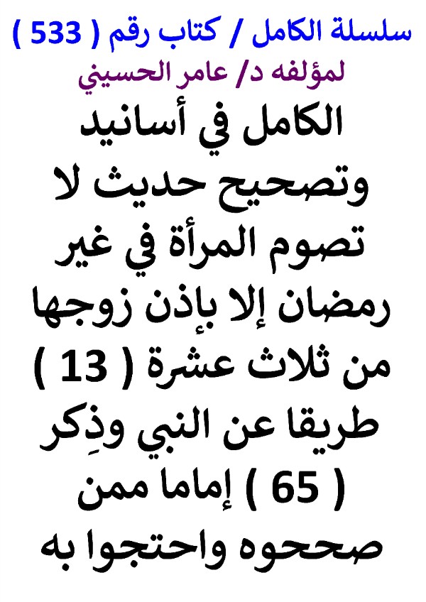 سلسلة الكامل / كتاب رقم ( 533 ) / ( الكامل في أسانيد وتصحيح حديث لا تصوم المرأة في غير رمضان إلا بإذن زوجها من ثلاث عشرة ( 13 ) طريقا عن النبي وذِكر خمسة وستين ( 65 ) إماما ممن صححوه واحتجوا به ) ، لمؤلفه د/ عامر الحسيني