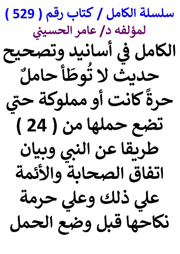 سلسلة الكامل / كتاب رقم ( 529 ) / ( الكامل في أسانيد وتصحيح حديث لا تُوطَأ حاملٌ حرةً كانت أو مملوكة حتي تضع حملها من ( 24 ) طريقا عن النبي وبيان اتفاق الصحابة والأئمة علي ذلك وعلي حرمة نكاحها قبل وضع الحمل ) ، لمؤلفه د/ عامر الحسيني