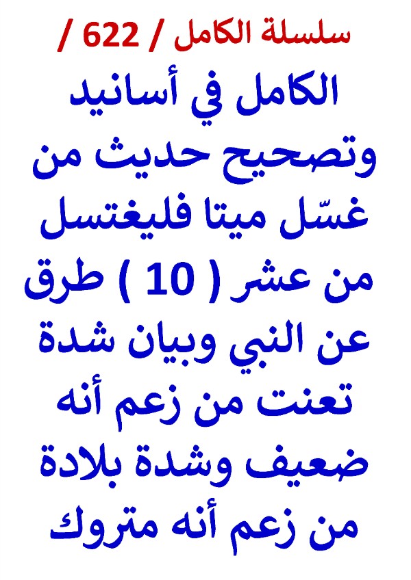 سلسلة الكامل / كتاب رقم ( 622 ) / ( الكامل في أسانيد وتصحيح حديث من غسل ميتا فليغتسل من عشر ( 10 ) طرق عن النبي وبيان شدة تعنت من زعم أنه ضعيف وشدة بلادة من زعم أنه متروك ) ، لمؤلفه د/ عامر الحسيني