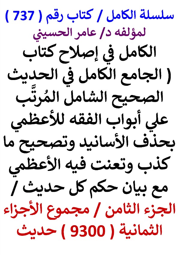 سلسلة الكامل / كتاب رقم ( 737 ) / ( الكامل في إصلاح كتاب ( الجامع الكامل في الحديث الصحيح الشامل المرتب علي أبواب الفقه للأعظمي ) بحذف الأسانيد وتصحيح ما كذب وتعنت فيه الأعظمي مع بيان حكم كل حديث / الجزء الثامن / مجموع الأجزاء الثمانية ( 9300 ) حديث ) ، لمؤلفه د/ عامر الحسيني