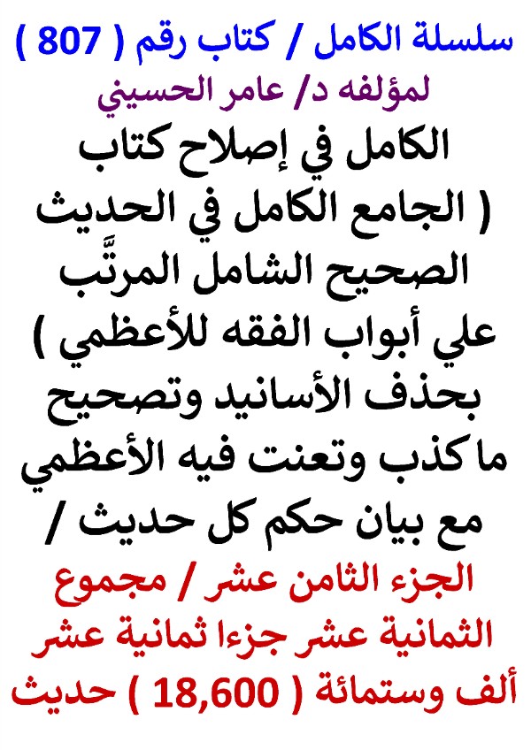 سلسلة الكامل / كتاب رقم ( 807 ) / ( الكامل في إصلاح كتاب ( الجامع الكامل في الحديث الصحيح الشامل المرتب علي أبواب الفقه للأعظمي ) بحذف الأسانيد وتصحيح ما كذب وتعنت فيه الأعظمي مع بيان حكم كل حديث / الجزء الثامن عشر / مجموع الثمانية عشر جزءا ثمانية عشر ألف وستمائة ( 18,600 ) حديث ) ، لمؤلفه د/ عامر الحسيني