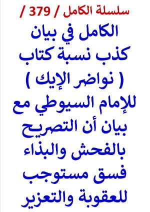 كتاب الكامل في بيان كذب نسبة كتاب نواضر الايك للامام السيوطي  بقلم عامر الحسيني ... سلسلة الكامل / كتاب رقم ( 379 ) / ( الكامل في بيان كذب نسبة كتاب ( نواضر الإيك ) للإمام السيوطي مع بيان أن التصريح بالفحش والبذاء فسق مستوجب للعقوبة والتعزير ) ، لمؤلفه د/ عامر الحسيني