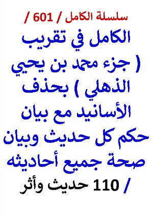 كتاب الكامل في تقريب جزء محمد بن يحيي الذهلي بحذف الاسانيد مع بيان حكم كل حديث من تأليف عامر الحسيني .. سلسلة الكامل / كتاب رقم ( 601 ) / ( الكامل في تقريب ( جزء محمد بن يحيي الذهلي ) بحذف الأسانيد مع بيان حكم كل حديث وبيان صحة جميع أحاديثه / 110 حديث وأثر ) ، لمؤلفه د/ عامر الحسيني