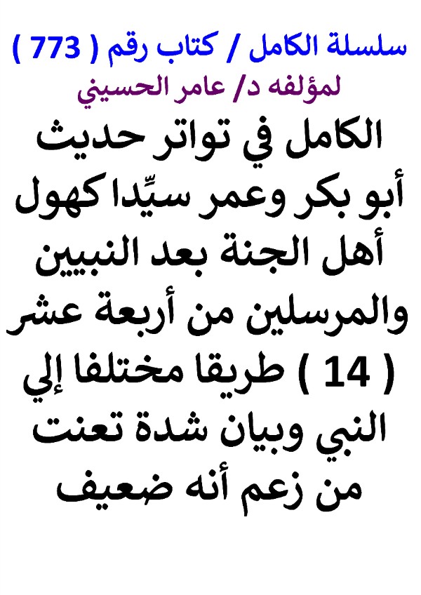 سلسلة الكامل / كتاب رقم ( 773 ) / ( الكامل في تواتر حديث أبو بكر وعمر سيدا كهول أهل الجنة بعد النبيين والمرسلين من أربعة عشر ( 14 ) طريقا مختلفا إلي النبي وبيان شدة تعنت من زعم أنه ضعيف ) ، لمؤلفه د/ عامر الحسيني