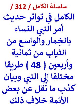 كتاب الكامل في تواتر حديث امر النبي النساء بالخمار والواسع من الثياب من ( 48 ) طريقا مختلفا بقلم عامر الحسيني....سلسلة الكامل / كتاب رقم ( 312 ) / ( الكامل في تواتر حديث أمر النبي النساء بالخِمار والواسع من الثياب من ثمانية وأربعين ( 48 ) طريقا مختلفا إلي النبي وبيان كذب ما نقل عن بعض الأئمة خلاف ذلك ) ، لمؤلفه د/ عامر الحسيني