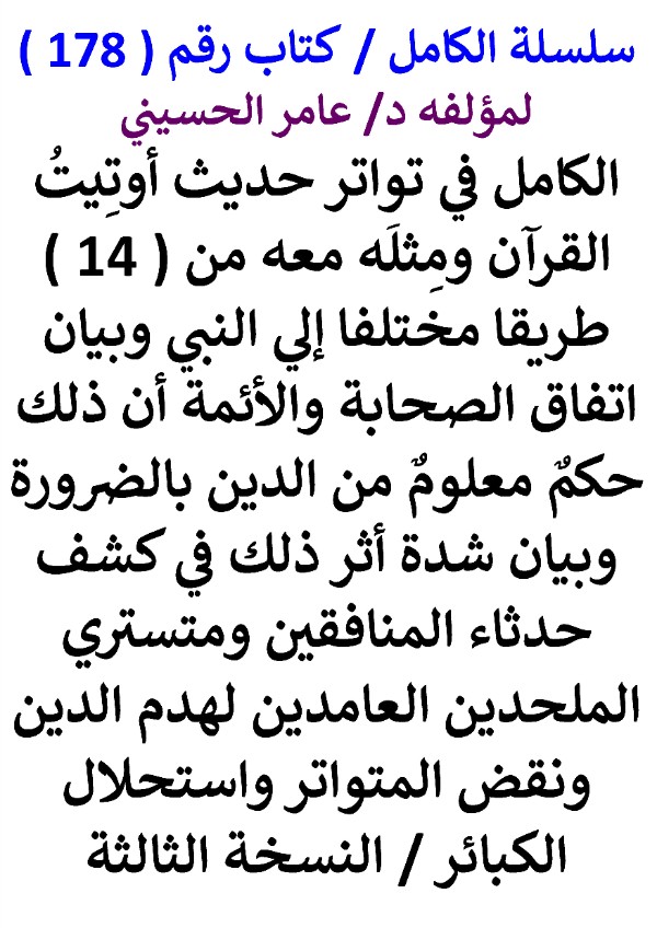 سلسلة الكامل / كتاب رقم ( 178 ) / ( الكامل في تواتر حديث أوتِيتُ القرآن ومِثلَه معه من ( 14 ) طريقا مختلفا إلي النبي وبيان اتفاق الصحابة والأئمة حكمٌ معلومٌ من الدين بالضرورة وبيان شدة أثر ذلك في كشف حدثاء المنافقين ومتستري الملحدين العامدين لهدم الدين ونقض المتواتر واستحلال الكبائر / النسخة الثالثة ) ، لمؤلفه د/ عامر الحسيني
