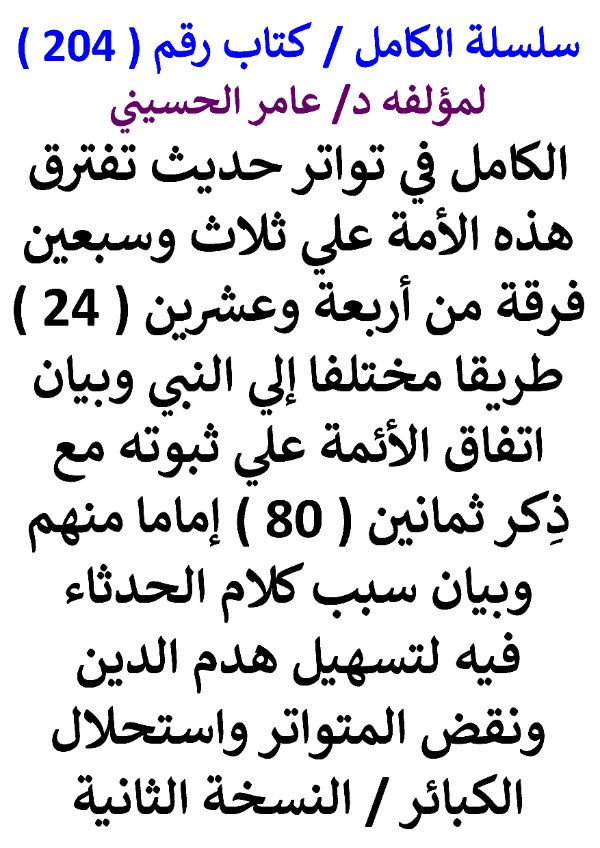 سلسلة الكامل / كتاب رقم ( 205 ) / ( الكامل في تواتر حديث تفترق أمتي علي ثلاث وسبعين فرقة من أربعة وعشرين ( 24 ) طريقا مختلفا إلي النبي وبيان اتفاق الأئمة علي ثبوته مع ذِكر ثمانين ( 80 ) إماما منهم وبيان سبب كلام الحدثاء فيه لتسهيل هدم الدين ونقض المتواتر واستحلال الكبائر / النسخة الثانية ) ، لمؤلفه د/ عامر الحسيني