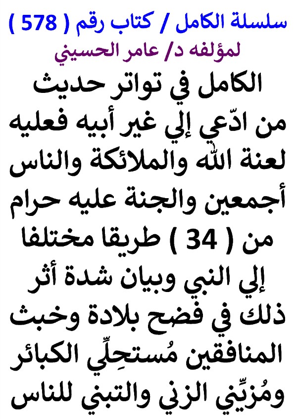 سلسلة الكامل / كتاب رقم ( 578 ) / ( الكامل في تواتر حديث من ادّعي إلي غير أبيه فعليه لعنة الله والملائكة والناس أجمعين والجنة عليه حرام من ( 34 ) طريقا مختلفا إلي النبي وبيان شدة أثر ذلك في فضح بلادة وخبث المنافقين مستحلي الكبائر ومُزيِّني الزني والتبني للناس ) ، لمؤلفه د/ عامر الحسيني